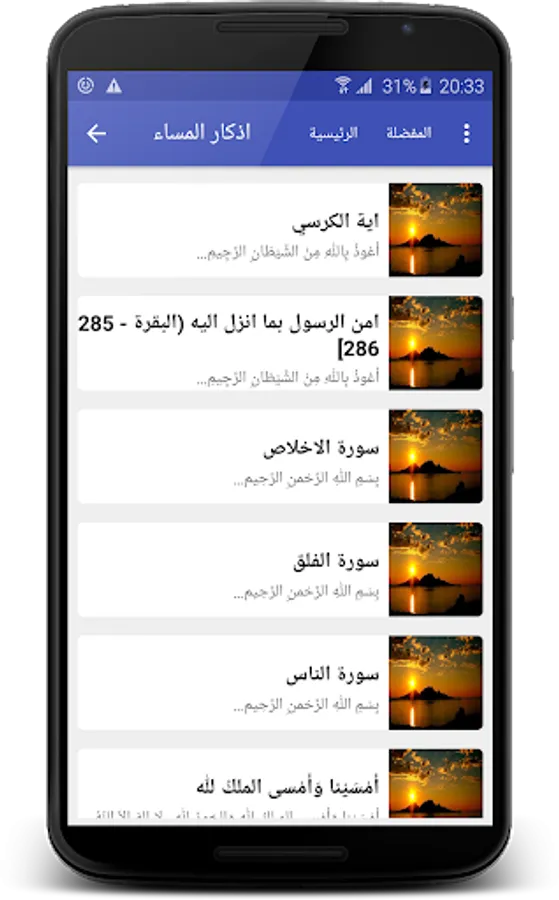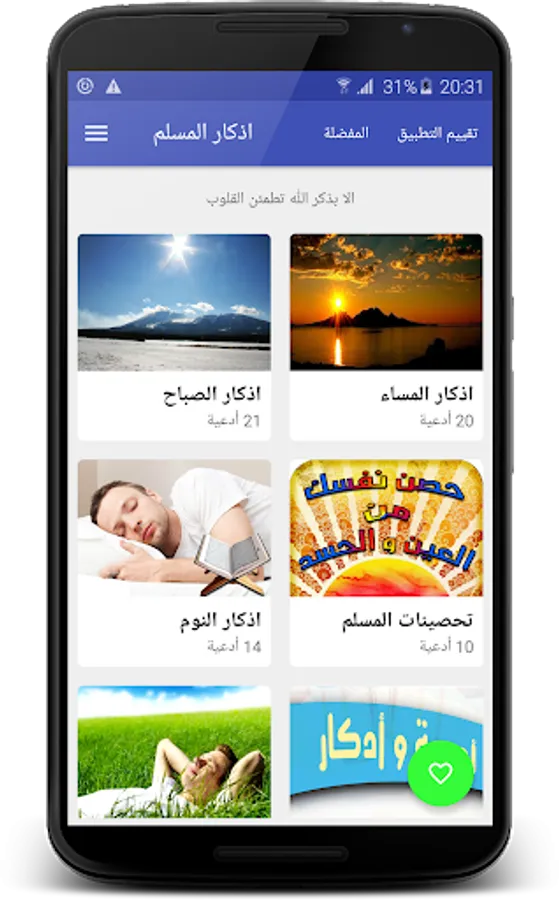 What distinguishes our application Morning and evening remembrance without the Internet is the ease of use only by choosing one of the sections Morning remembrance Sleep deprivation and evening supplications or various supplications Fortress of the Muslim moves directly to the content allocated to each classification Remembrance of the Muslim works automatically is an advantage in most applications but our application has relied on another feature to show Remember me.