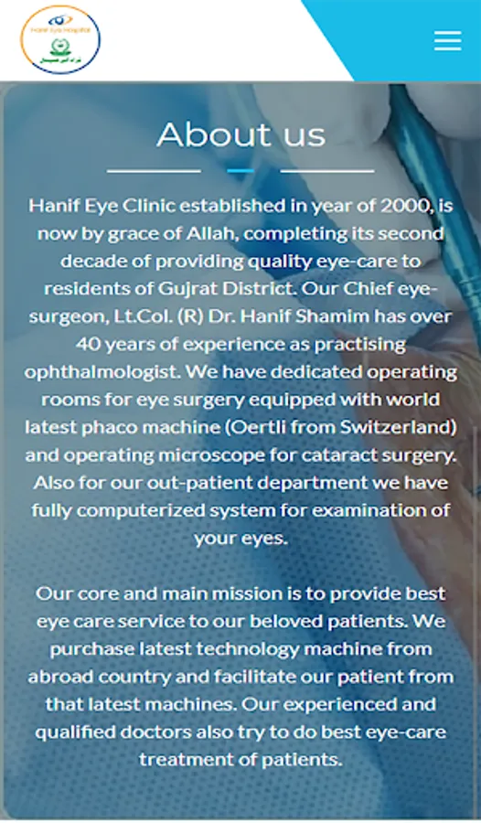 Our Chief eye-surgeon, Lt.Col. (R) Dr. Hanif Shamim has over 40 years of experience as practising ophthalmologist.