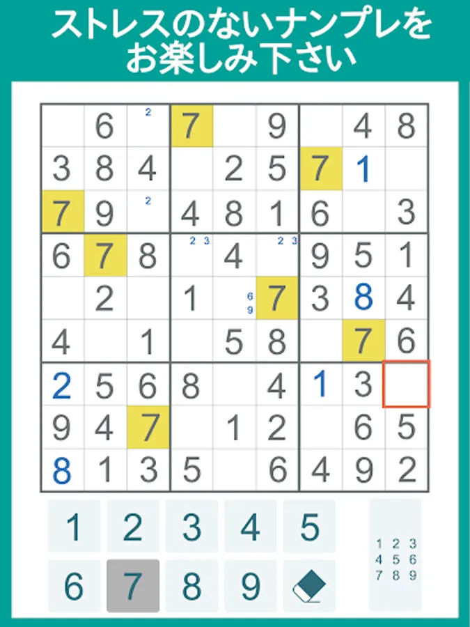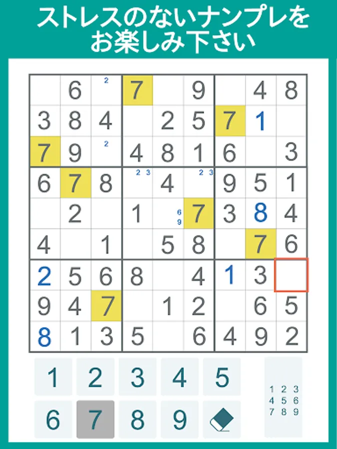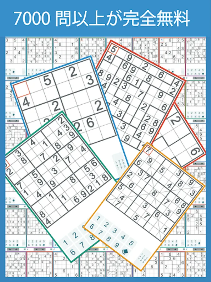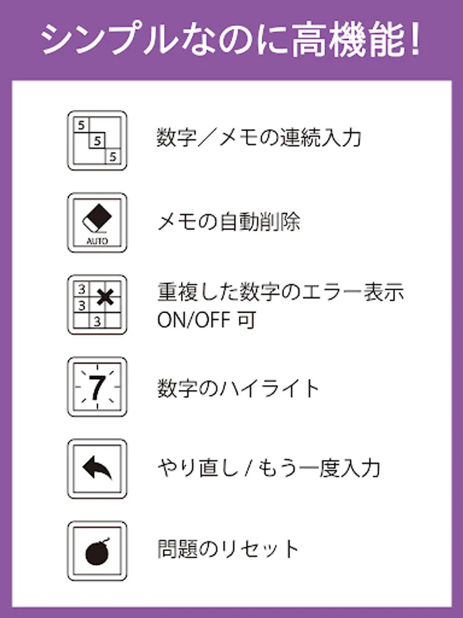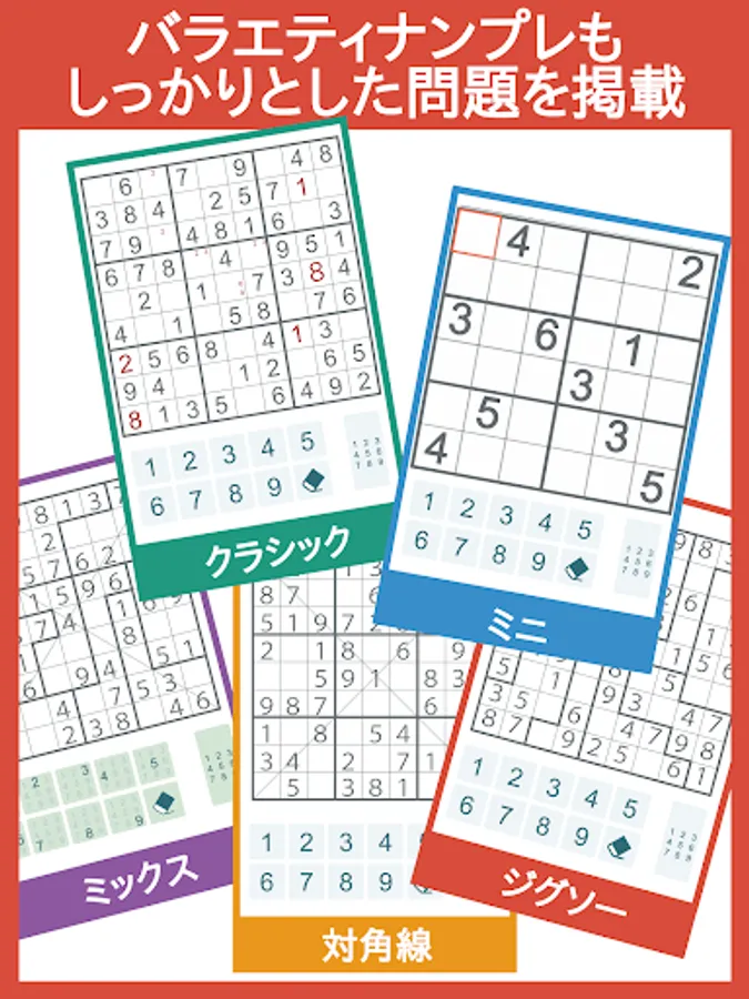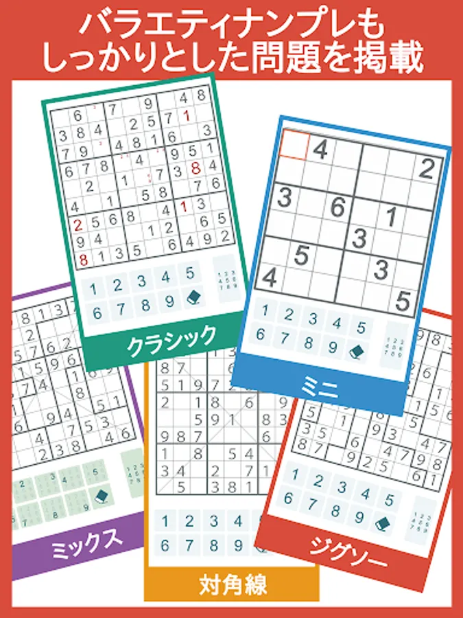 Including regular "Classic Sudoku", 6x6 squares "Mini Sudoku", diagonal lines, Jigsaw, and 5 types of puzzles are packed! Moreover, we aimed for excellent problems with good quality!