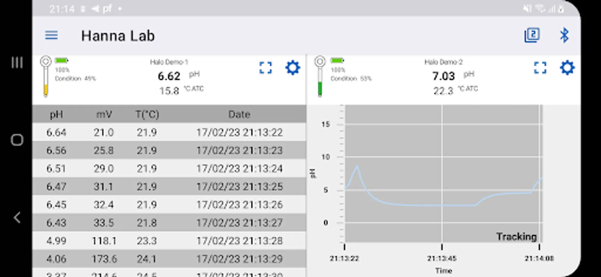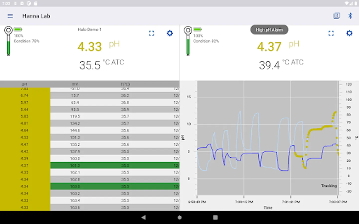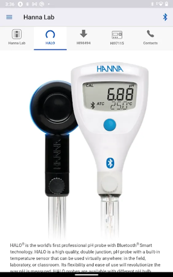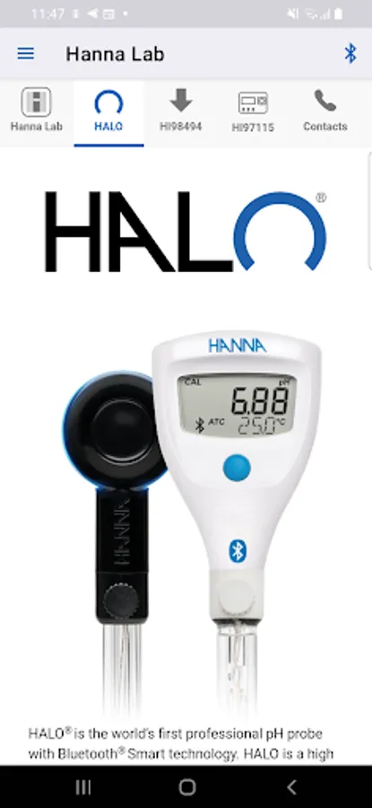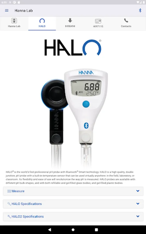 The Hanna Lab App turns an Android device into a full-featured pH meter when used with a Hanna Instruments HALO® or HALO2 pH probes with Bluetooth® Smart technology, or a data management system when used with a Hanna Instruments HI98494 multiparameter Bluetooth portable pH/EC/DO meter or HI97115 Marine Master waterproof multiparameter photometer.