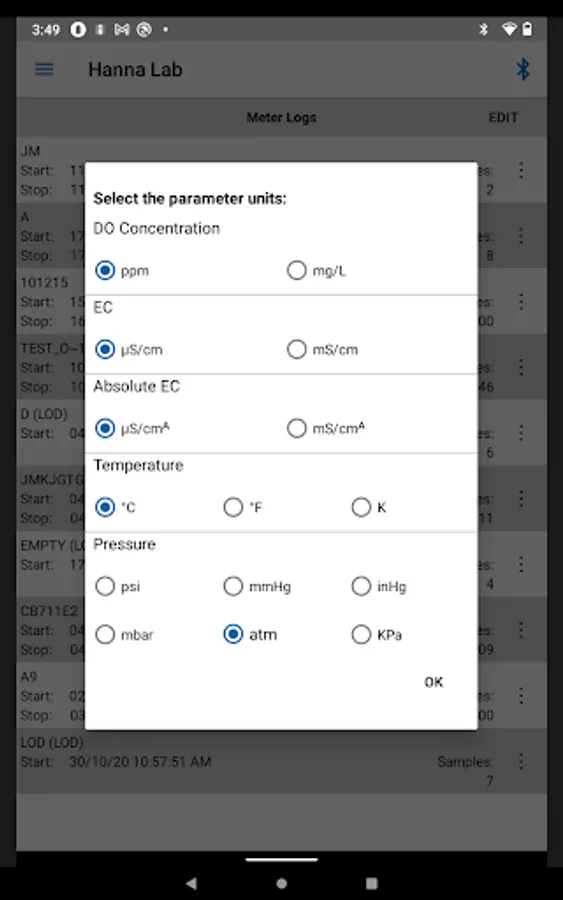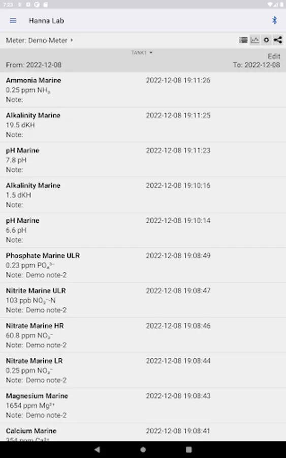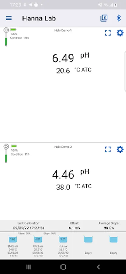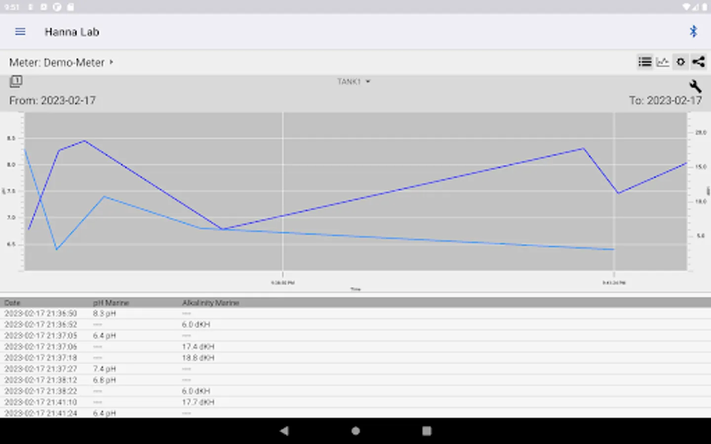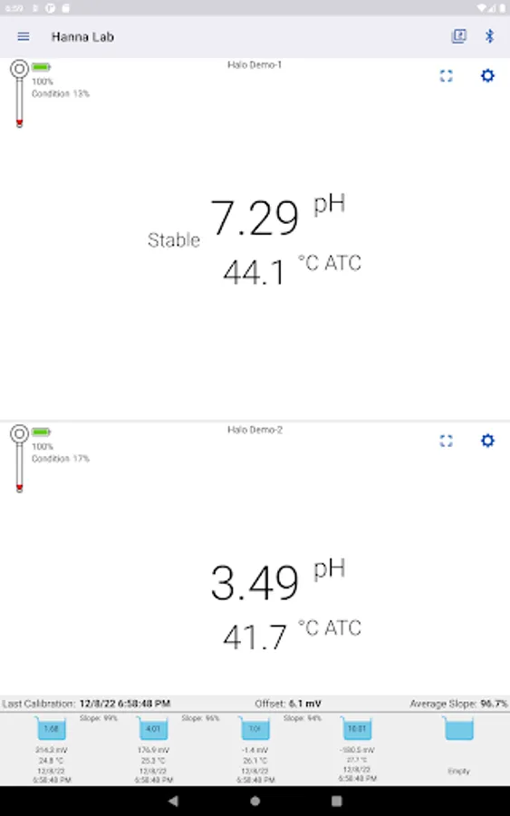 The Hanna Lab App turns an Android device into a full-featured pH meter when used with a Hanna Instruments HALO® or HALO2 pH probes with Bluetooth® Smart technology, or a data management system when used with a Hanna Instruments HI98494 multiparameter Bluetooth portable pH/EC/DO meter or HI97115 Marine Master waterproof multiparameter photometer.