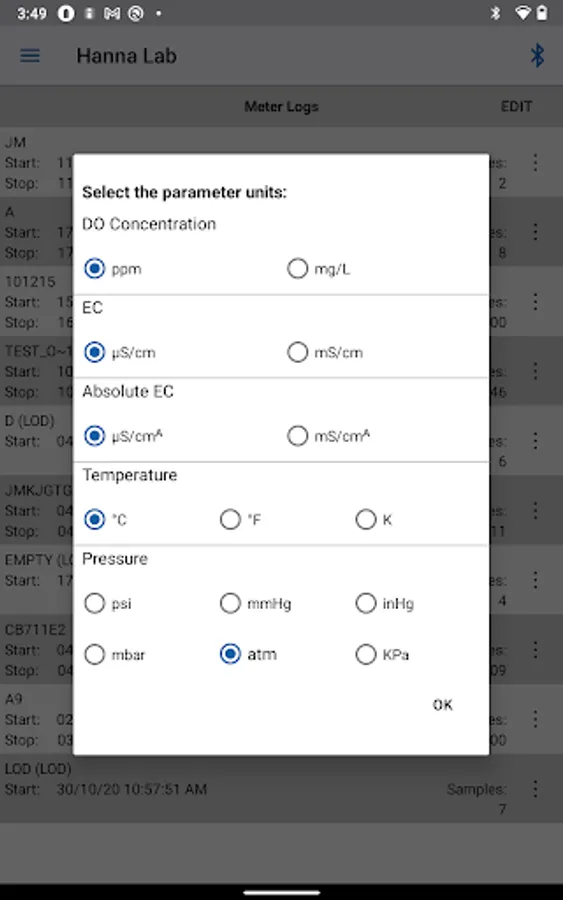 When used with a HI98494 Multiparameter Bluetooth Portable pH/EC/DO Meter, functions include data sharing and downloading. Downloaded data can be displayed as tabulated data or as a graph with user-selectable axes. The graph can be panned and zoomed with pinch-to-zoom technology for enhanced viewing. Additional features include GLP information for the previous 5 calibrations for all measurements and user-selectable measurement units.