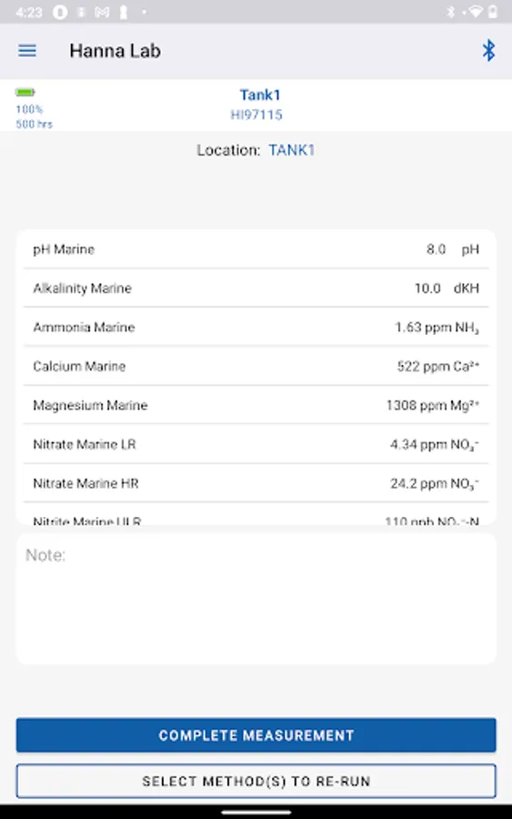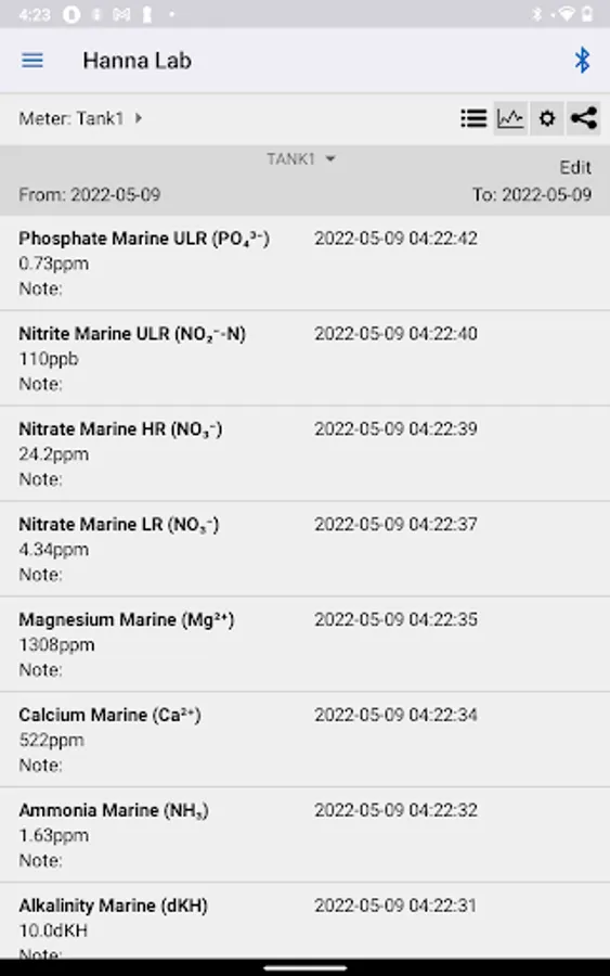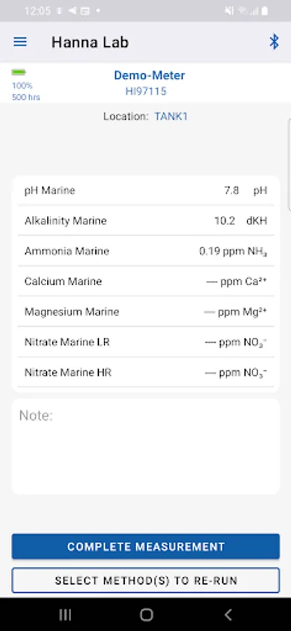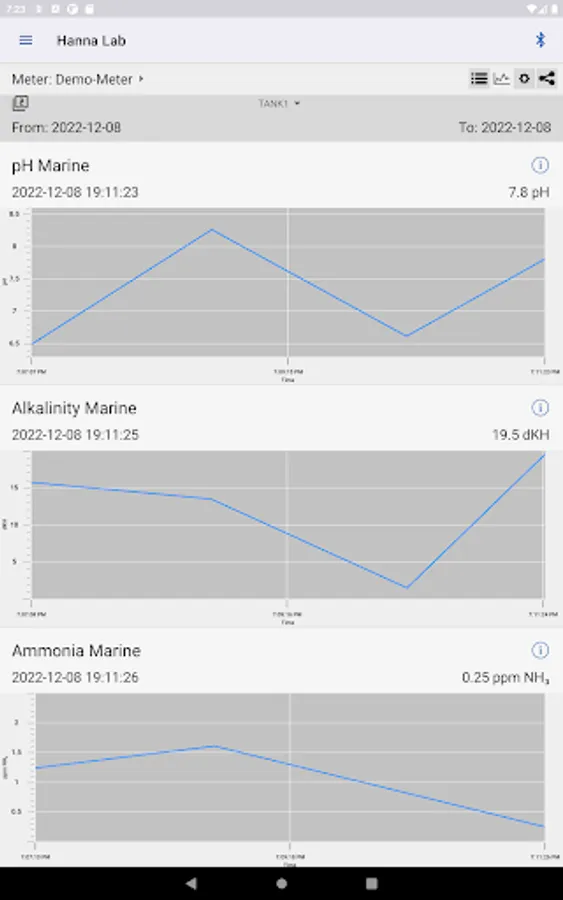 When used with a HI97115 Marine Master waterproof multiparameter photometer, functions include method groups, data sharing, and location trend data. Readings can be collected using the Hanna Lab App or synced directly from the HI97115 meter. All saved readings are visible in the log history. Readings can viewed by meter, location and method. Readings can be displayed as tabulated data or as a individual method graphs or a multiparameter graph with user-selectable axes. The graph can be panned and zoomed with pinch-to-zoom technology for enhanced viewing. A demo meter has been included showing all the features of this meter.
