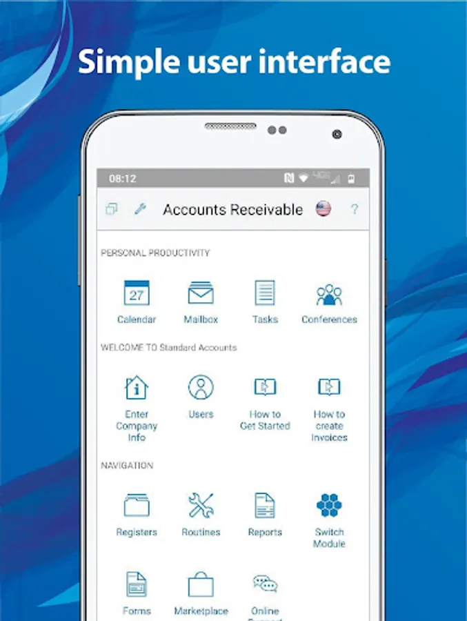 • Accounts Receivable: Create invoices and record receipts while tracking the billing status of your receivables and balances due.