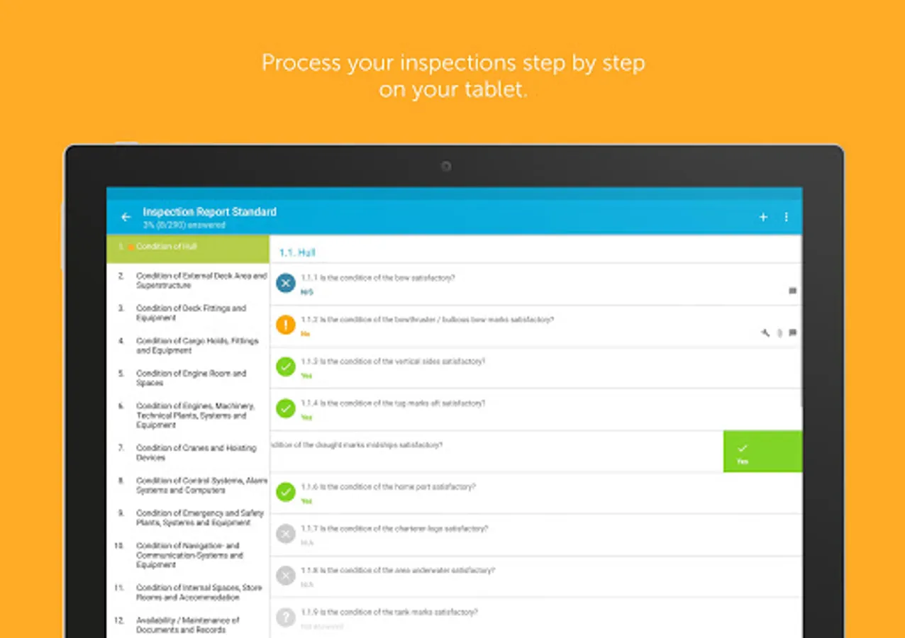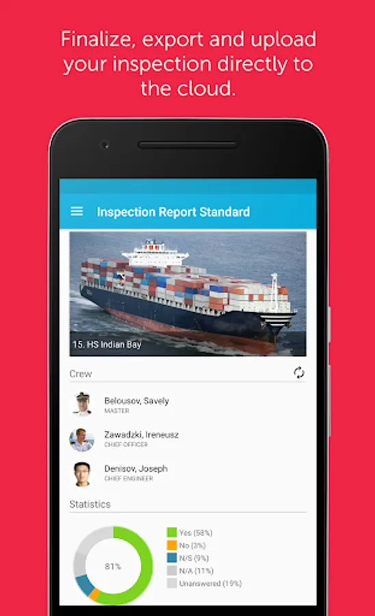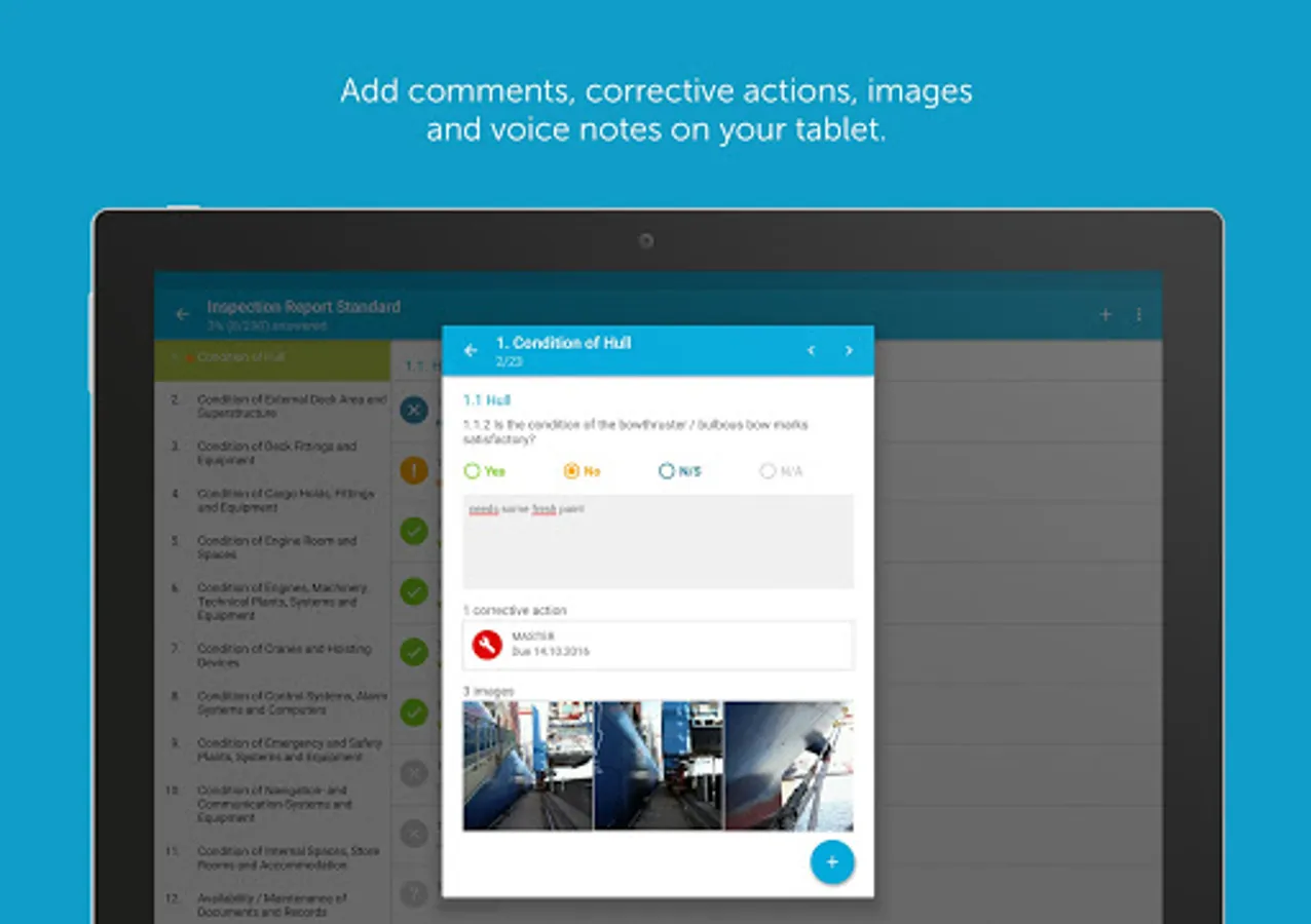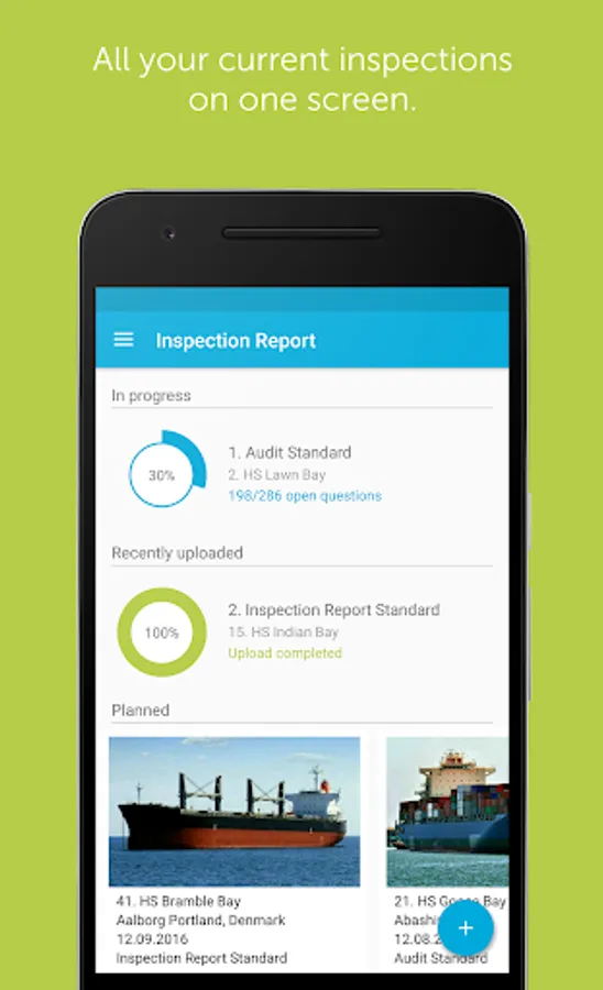 Profit from optional standardized surveys for your company or set up ad-hoc-audits. No matter what you do, Inspection Report will support you to reach high-quality and precisely evaluable results. These results can be used to judge the performance of your crew and the condition of your fleet.
