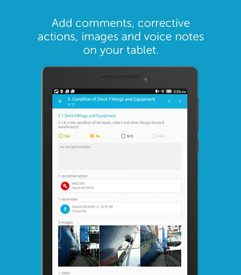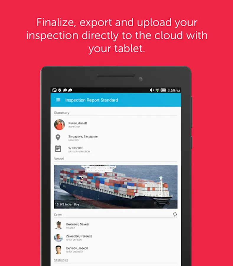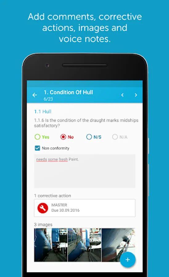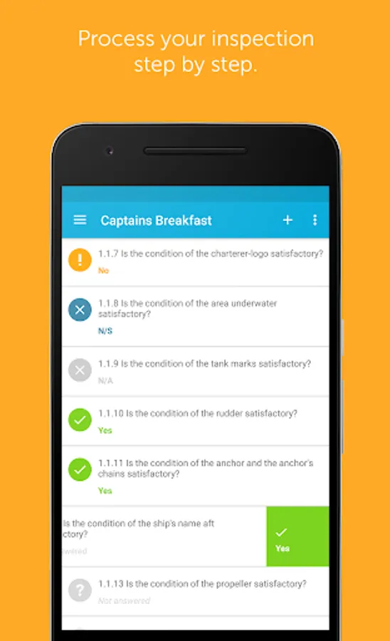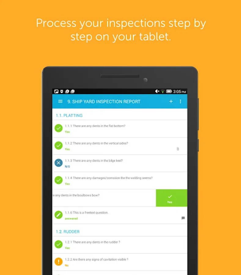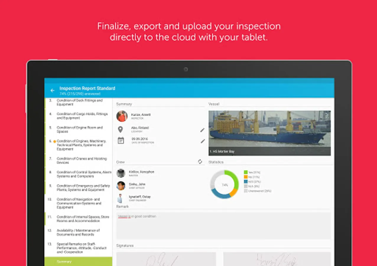 Profit from optional standardized surveys for your company or set up ad-hoc-audits. No matter what you do, Inspection Report will support you to reach high-quality and precisely evaluable results. These results can be used to judge the performance of your crew and the condition of your fleet.