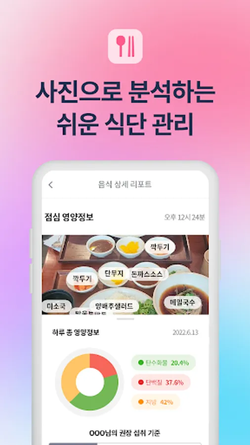 - Measure and automatically calculate the food name, calories, nutrients, and tandanji (carbohydrate, protein, fat) ratio, and provide an AI analysis statistical graph so that it is easy to understand at a glance!