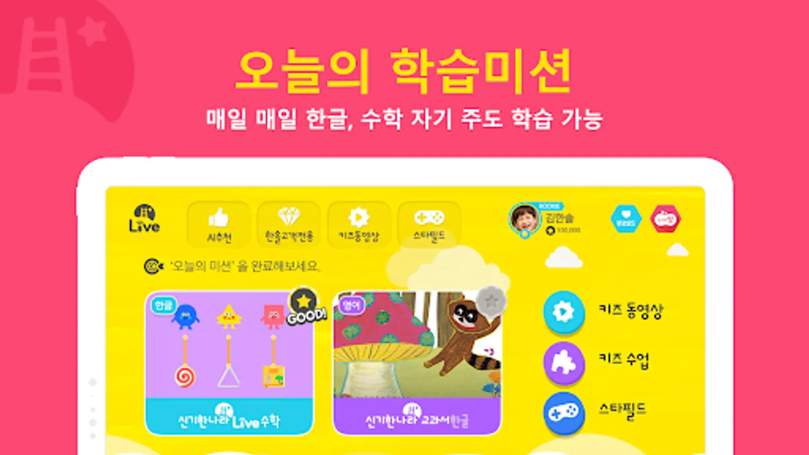 Every day, by participating in the ‘Today’s Learning Mission’ and achieving the ‘Attendance Mission’, which consists of learning contents from Mysterious Hangeul Nara and Mathematics Nara, you can receive star points rewards, enjoy motivation, and learn self-directed learning!