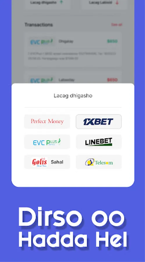 EvcPlus, Jeeb, E-Dahab, E-Sahal, Golis, 1Xbet iyo Perfect Money
