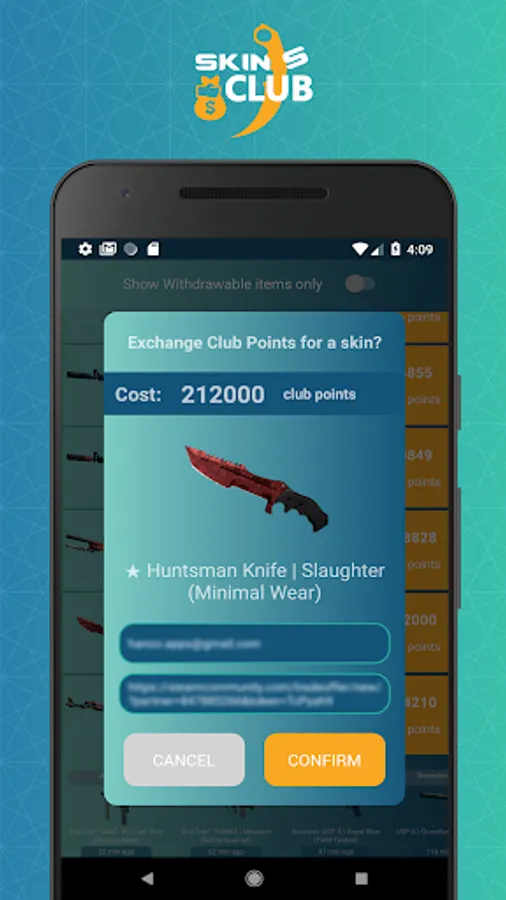Whenever you collected enough amount of club points you can easily exchange them to desired skins or another available virtual item. Withdraws process is fast and simple, items are delivered by your public steam trade url.