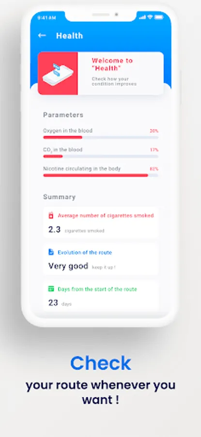 With the health section you can monitor your progress and check the levels of oxygen, nicotine and carbon dioxide in the blood. From now on, quitting smoking will become easier if you do it with Smokeless!