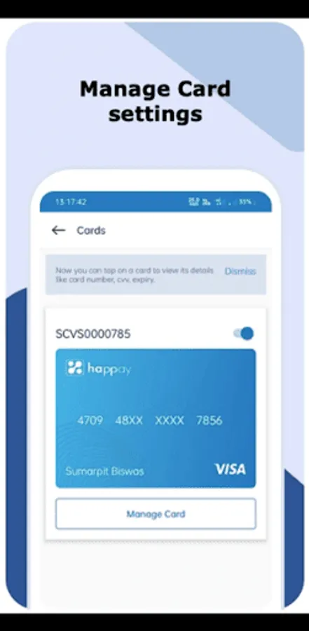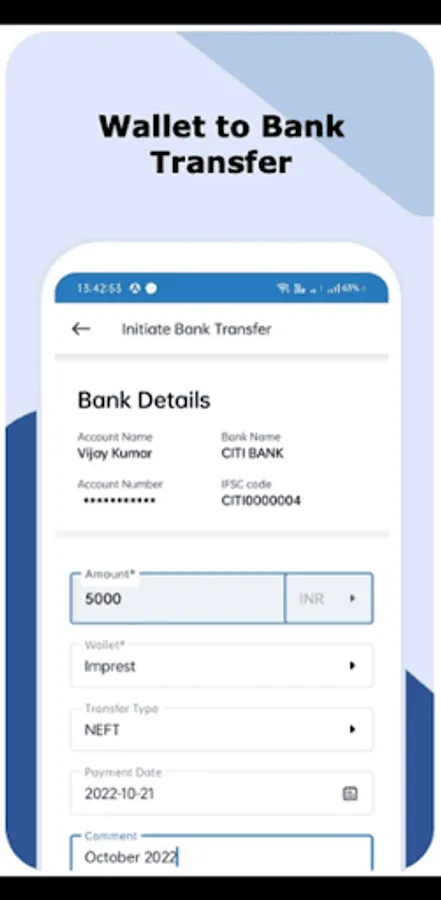 Our app helps you to receive salaries directly in your wallet. You will be equipped with cards which can be used for ATM withdrawals, POS and Online transactions. You can control and manage your card spends using our Manage Cards feature. You can also transfer your money into your bank account in seconds.