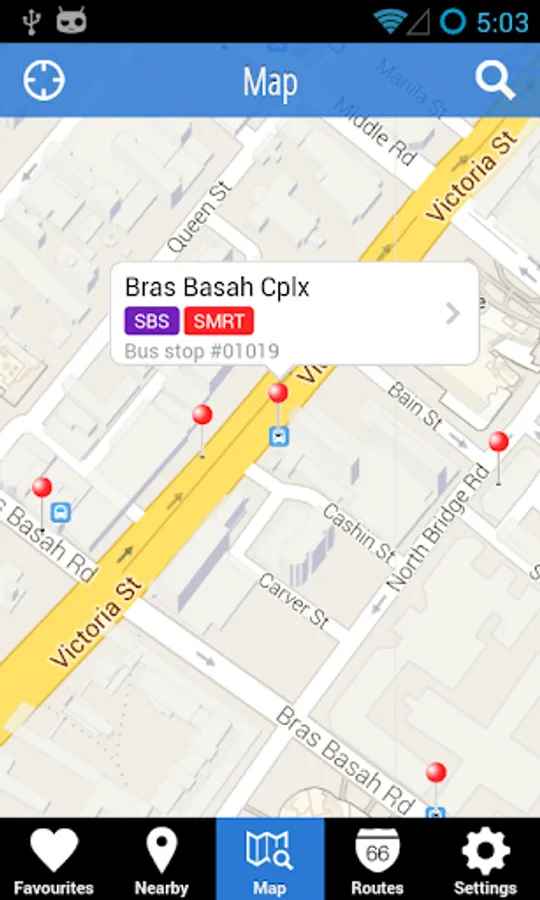 bus@sg shows you a list of bus stops near your current location, sorted by distance. You can tap the "locate" button next to the stop name to show it on the map.