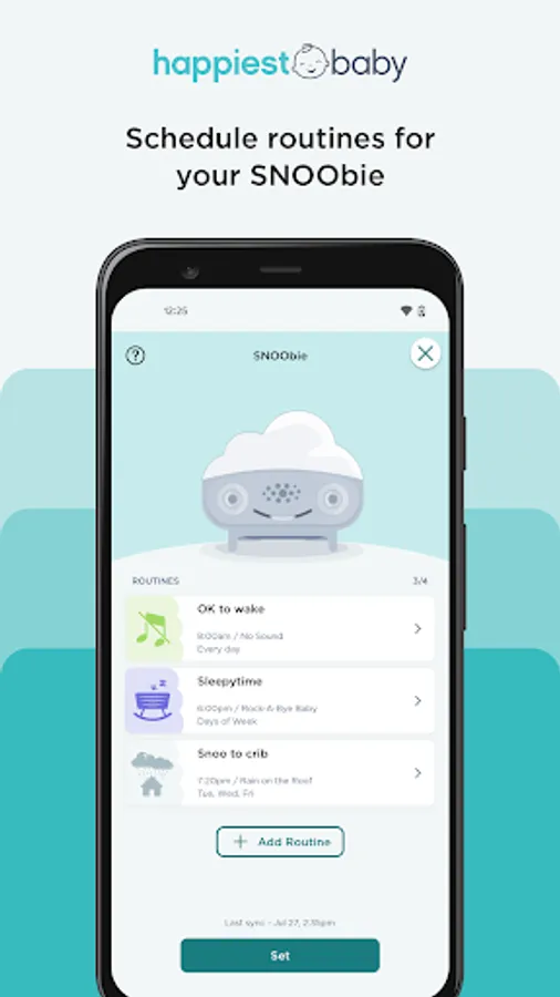 Connect and have fun with your SNOObie routines! Choose your favorite SNOObie light + sound cues to create up to 4 routines at a time that fit your family. To create a routine, pick your preferred light color, sound, time, and day(s) of the week. Once you save the routine, set it by tapping your device to SNOObie, and your routine will be ready to play when the scheduled day and time arrives.