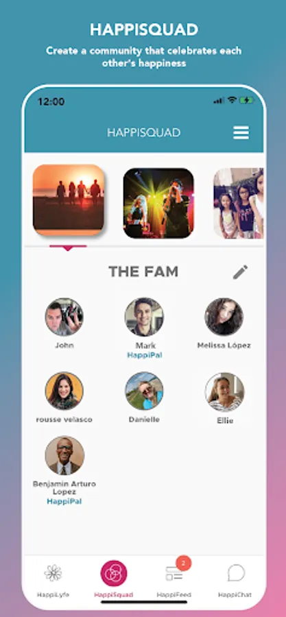 HAPPISQUAD is the entry point to the community features of HappiLyfe. The user can build up to three (3) HAPPISQUADS, each with up to nine (9) HappiLyfers each, for a total of 27 connections. This is a way to stay connected with the people in their life with whom they are most vested in each other’s happiness. The user is able to select up to three (3) HAPPIPALS (accountability partners) to help them stay on track around FOCUS and REFLECTION.