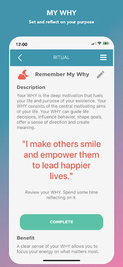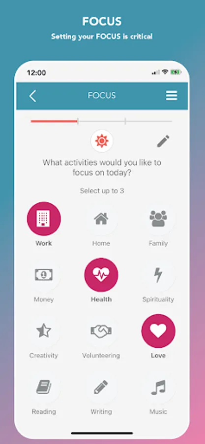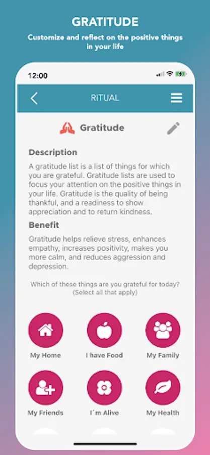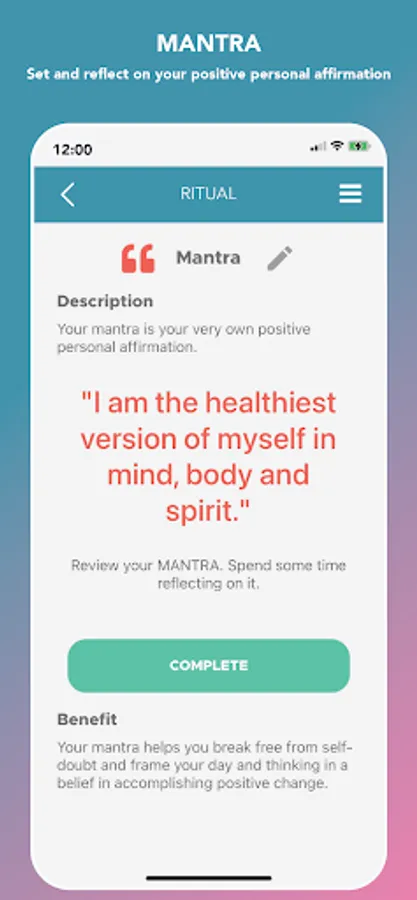 RITUAL helps the user stay in balance by setting their FOCUS for the day and providing access to complete or check off the following wellness tools: