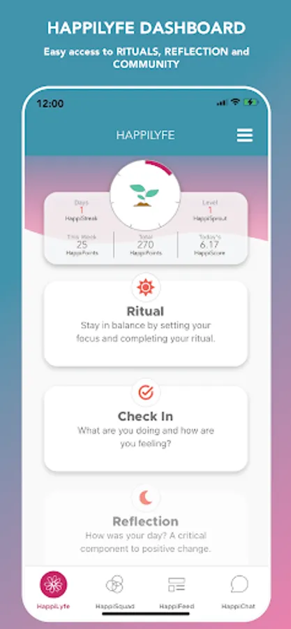 The HappiLyfe home page provides a dashboard, tracking progress and engagement with HappiLyfe, and providing access to the major tools of HappiLyfe (RITUAL, CHECK IN and REFLECTION), along with access to the community features of HappiLyfe (HAPPISQUAD, HAPPIFEED and HAPPICHAT).