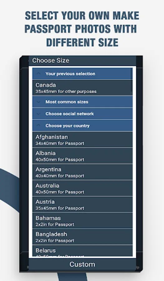 Select your correct country and verify the size of your passport photo.