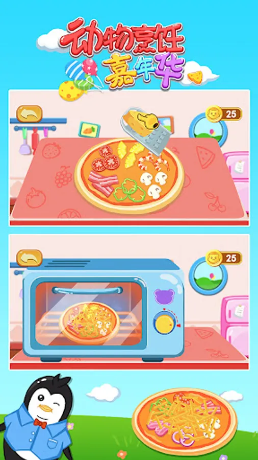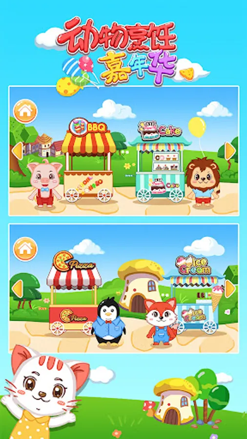 In this quiet town, there is a food cooking street where all kinds of animal friends visit every day, Mr. Penguin, little pig, and little kitten, they come here a lot, let's make some food for them. Barbecue, hamburgers, cakes, cookies, what kind of food would you like to cook. Colorful ice cream, different shapes of cakes, delicious barbecue, bacon and mushroom pizza, or green pepper and beef pizza, cook as you like. Complete the game and get gold coins and unlock various ingredients and props.