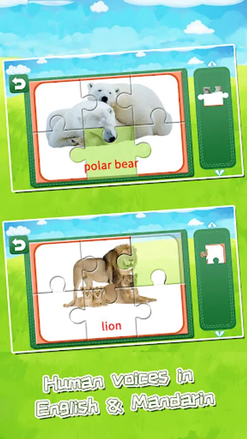 This jigsaw puzzle educational game is designed for 2-5 years old kids which featured with large range of common things in our daily life. We also used a variety of sound to attract the kids and develop their interest. Players can select the jigsaw puzzle in 4pcs, 6pcs or 9pcs which is suitable for different age of kids. After the kids completed the jigsaw puzzle the app will show and pronounce the words in English and Mandarin. It also help the kids to memorize the spelling of the words.