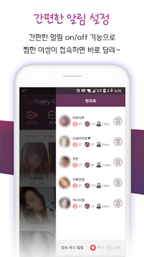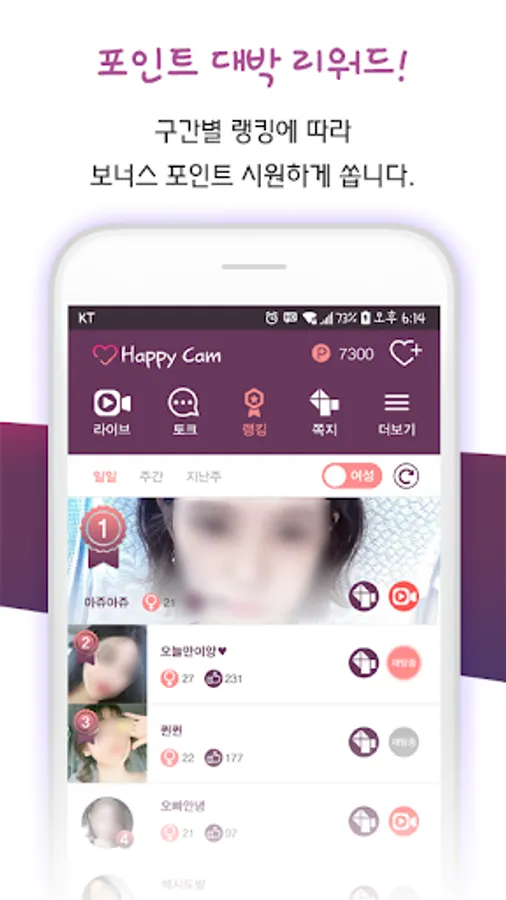 Happy Cam operates real-time monitoring for the safety of users and strictly manages advertisements, profanity, and slander.