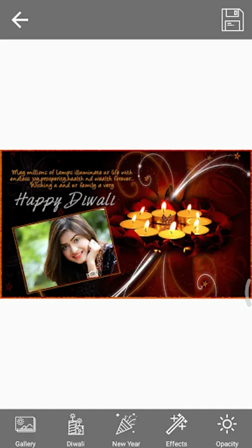 Happy Diwali / New Year Photo Frame contains awesome Greetings. Make this Diwali more special by wishing your friends,family and beloved ones with your unique greetings. Happy Diwali Photo Frames contains nicely designed greetings, happy diwali wishes, candles and crackers,lighting deepam greetings.