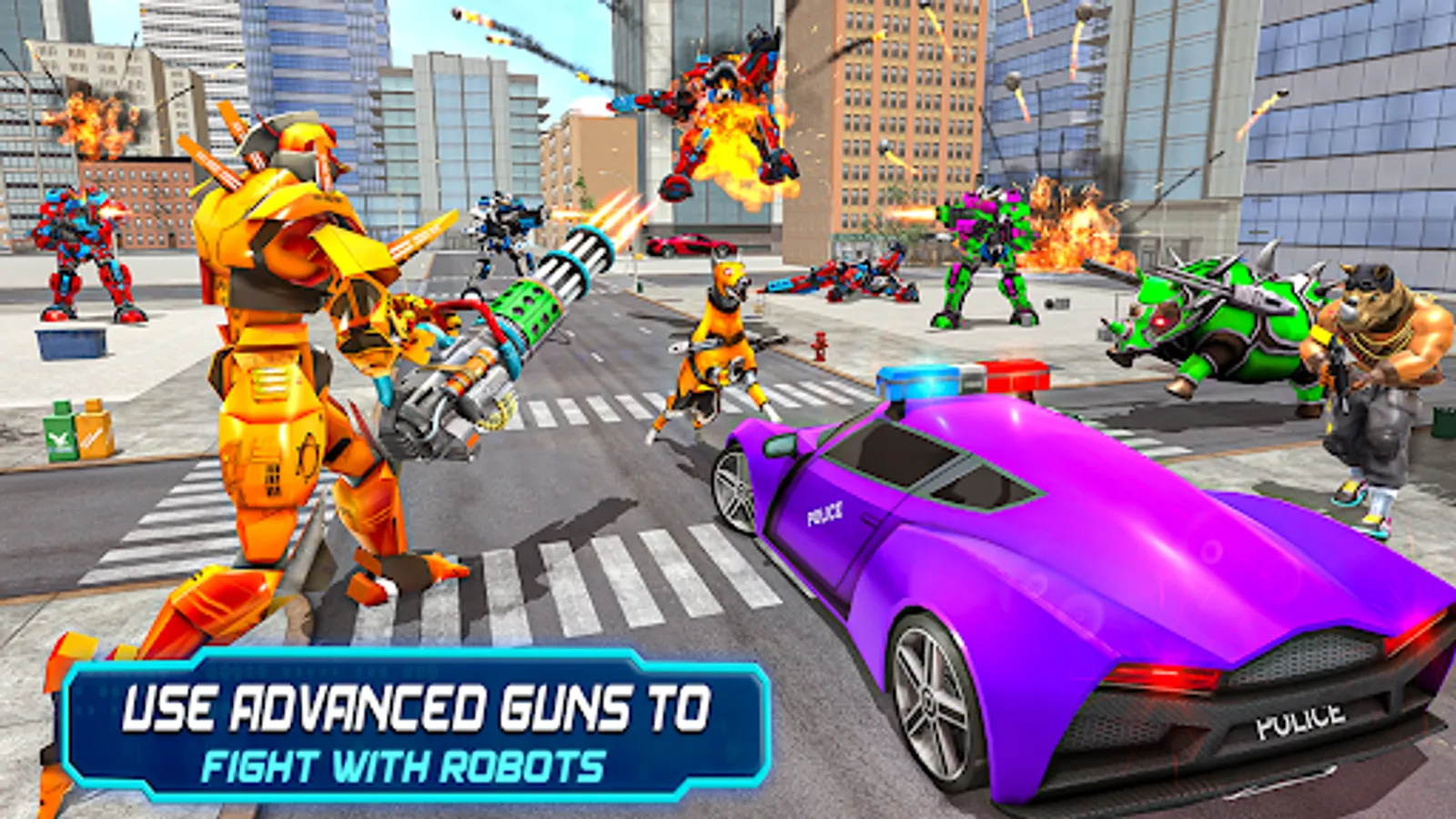Are you ready to play police robot car games and robot shooting games? If yes! Be the part of robot car games in city police robot city rampage robot wala game. Destroy everything in the city rampage police robot games just like the real dragon robot, dino wali robot games & multi animal robot car game. Try multi robot cars with variety of heavy machine guns fighting against the battle machines and mech robot in this modern police robot car game. One the best robot car games with police robot fighting games depicts the major robot car destruction of modern city because of some evil robots are showcasing the outrageous display of their destructive shooting powers in this flying robot car game. Play and enjoy the realistic police robot car transforming games enclosing the highlighted features of police rampage robot car games. Transforming robot car rampage game inside robot car shooting game is specially designed for players to have exciting pleasure of police car robot transforming games.