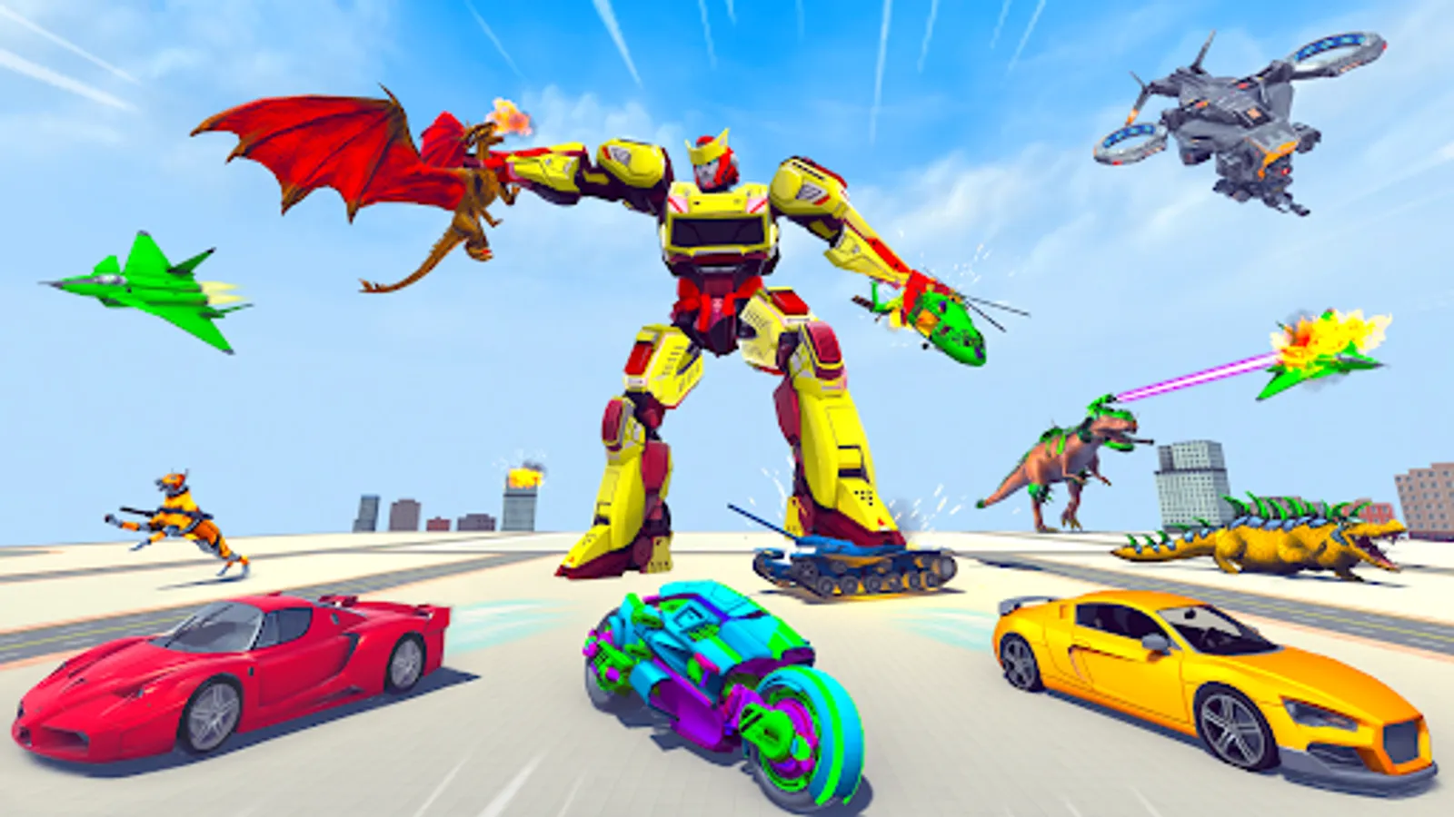 Use the robot gun weapon store to purchase guns and select the most powerful weapons to enjoy the robot car shooting gun games. There are multiple weapons including, Bazooka, mini gun, ak47, smg etc in robot transformation car games. Realistic animations of multiple transforming robot car games are there to provide the user with best experience of real robot wars amongst battle machines and future robots in police robot fighting games and robot transforming car games. In police robot car wali games, shoot down all the buildings and turn the robot city into ruins killing all the residents and alien robotic forces in dragon robot wali car game and helicopter robot car game. In car transforming games, it might be really hard for you to tackle and eliminate all the battle machines and mech robot warriors but collect the courage to fight the final battle and futuristic robot war in real robot car game. If you have ever been in love with police robot shooting car games, you must try robot car games & robot car shooting game. Fight the ultimate robot transform battle and stand victorious in all the mech robots and grand robots inside robot car shooting games.