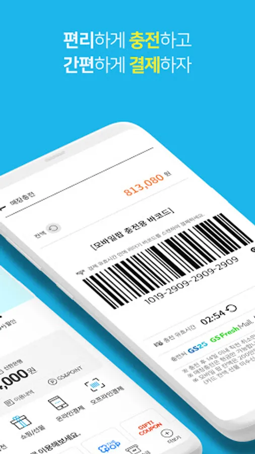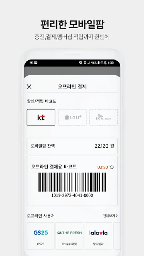 Mobile Pop can be used for easy payment using barcodes at GS25, GS THE FRESH, Lalavla, Lotte Cinema, KFC, etc. nationwide, and can also be used at over 800 Happy Money online locations.