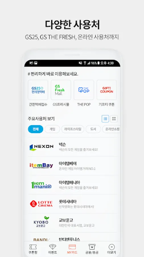 You can easily top up GS25, GS THE FRESH, and Lalavla nationwide, as well as within the app, and you can check your balance, payment, and recharge history at a glance.