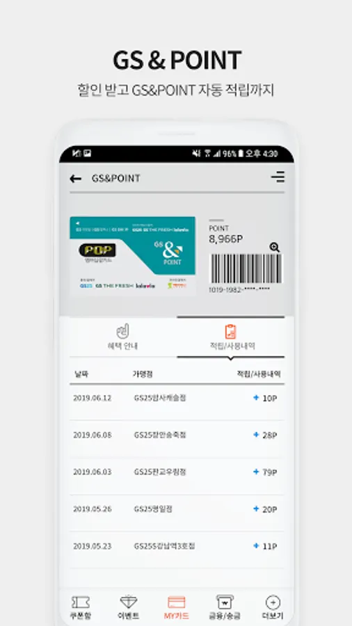 GS&POINT is automatically accumulated when making mobile pop payments at GS25, GS THE FRESH, and Lalavla nationwide, and the accumulated GS&POINT can be used at GS25, GS THE FRESH, Lalavla, GS Fresh Mall, GS Caltex, and GS SHOP.