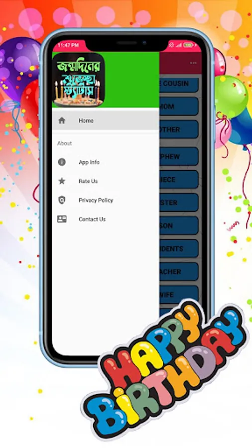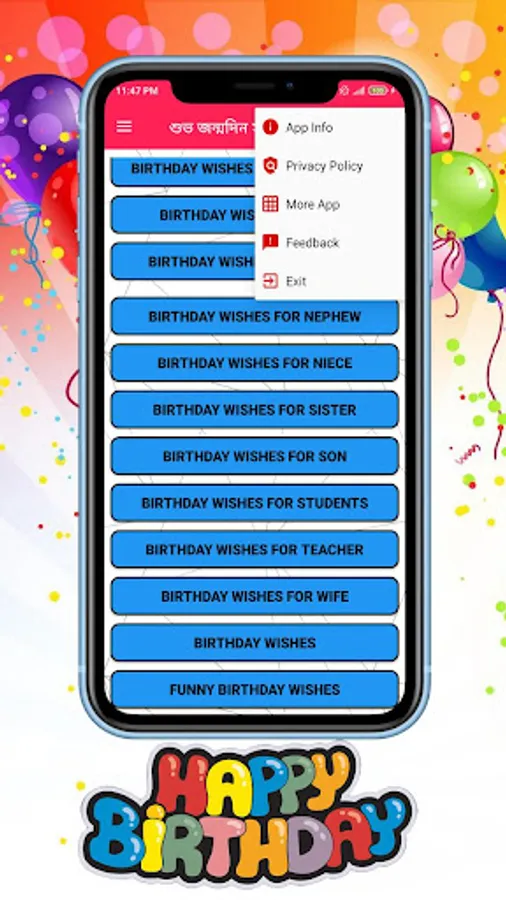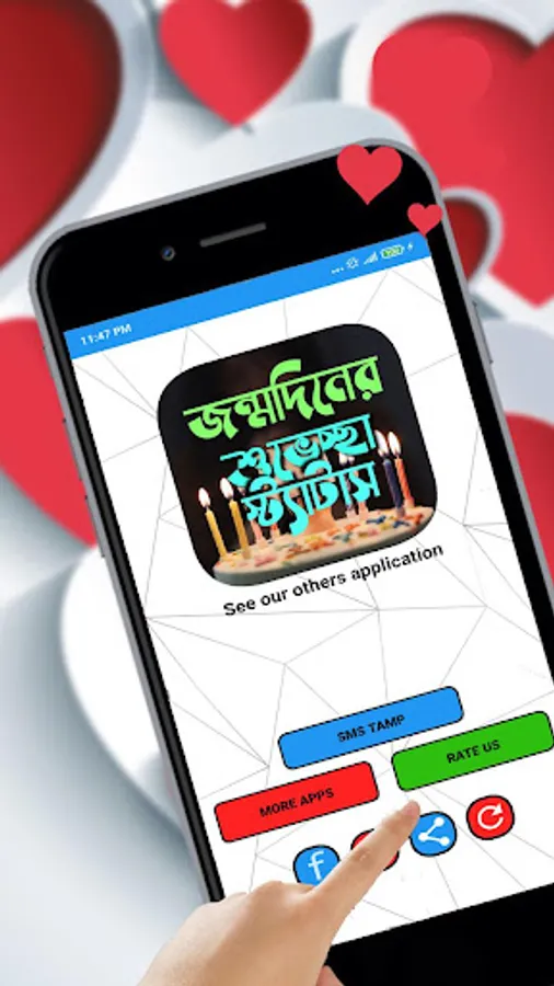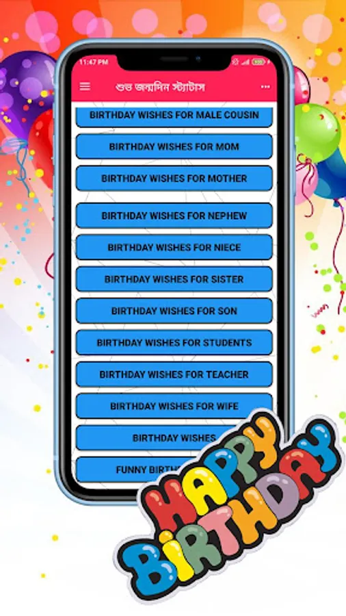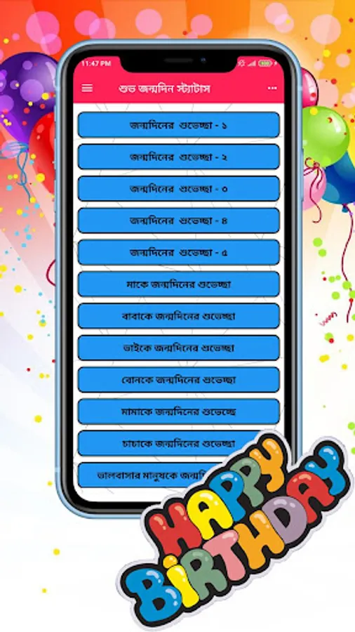 জন্মদিনের শুভেচ্ছা সবাইকে। আজ আমরা হাজির হয়েছি “জন্মদিনের শুভেচ্ছা স্ট্যাটাস নামক স্ট্যাটাস অ্যাপ নিয়ে। Happy Birthday SMS to everyone. জন্মদিনের এসএমএস পাঠানোর জন্য সুন্দর একটি অ্যাপ।এখানে আপনি পাবেন খাটি বাংলায় লিখিত চমৎকার সব মেসেজ।এখান থেকে sms কপি করুন আর পাঠিয়ে দিন যে কাউকে অথবা ফেসবুক এ স্ট্যাটাস দিন।এখানে আপনি পাবেন প্রেম ভালোবাসার SMS থেকে শুরু করে রুমান্টিক ভালোবাসার জন্য বন্ধুবন্ধবের জন্য এসএমএস।বিভিন্ন ক্যাটাগরিতে যে এসএমএস sms গুলি পাবেন তা হলো- স্ত্রীর জন্মদিনের শুভেচ্ছা, সন্তানের জন্মদিনের শুভেচ্ছা, বান্ধবীকে জন্মদিনের শুভেচ্ছা, বড় ভাইকে জন্মদিনের শুভেচ্ছা স্ট্যাটাস, প্রেমিকার জন্মদিনের শুভেচ্ছা, পুত্রকে জন্মদিনের শুভেচ্ছা, দেরিতে জন্মদিনের শুভেচ্ছা। এখানে পাবেন সকল প্রকার জন্মদিনের শুভেচ্ছা এসএমএস সম্পূর্ণ বাংলায় । সবগুলো জন্মদিনের শুভেচ্ছা এসএমএস সুন্দর করে সাজিয়ে রাখা হয়েছে । আপনার পছন্দ মতে যেকোন এসএমএস এক ক্লিকেই পাঠিয়ে দিতে পারেন। এই শুভ জন্মদিনের শুভেচ্ছা স্ট্যাটাস এবং এসএমএস গুলো সবার জন্য উন্মুক্ত ।