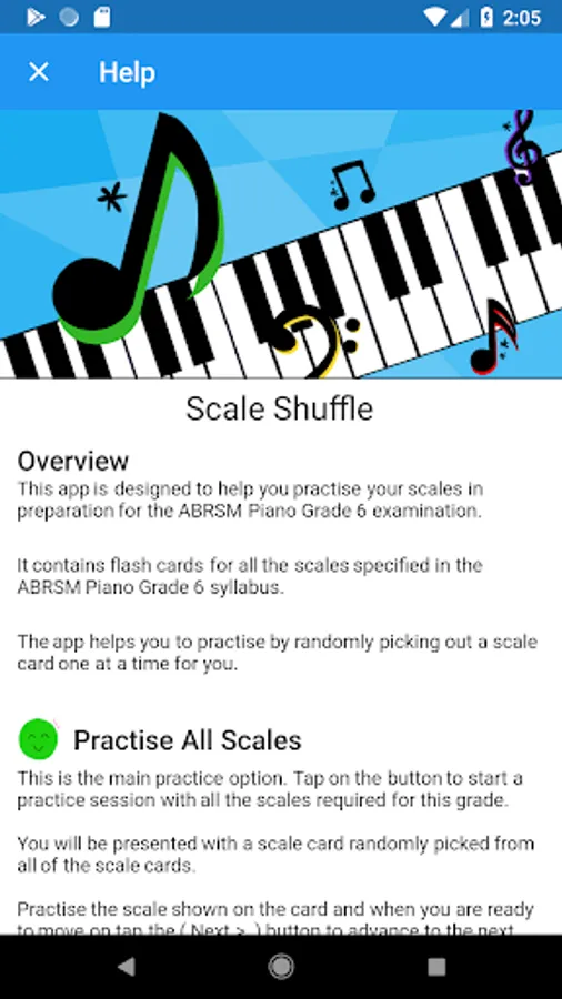 Scale Shuffle will systematically help you achieve your goal by picking out a scale flashcard for you to practise randomly, one at a time. The app contains all the scales from the most up-to-date ABRSM syllabus - and once you’ve practised all the scales, you can go back to the beginning and start all over again. The scale flashcards are shuffled each time you reset, so they’ll always appear in a totally random order.