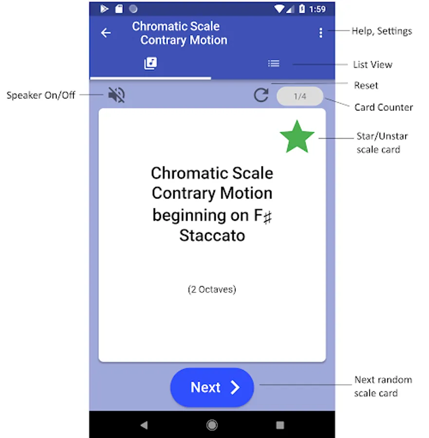 - Option to practise the list of 'starred' scales, so you can play through the ones that you personally find tricky