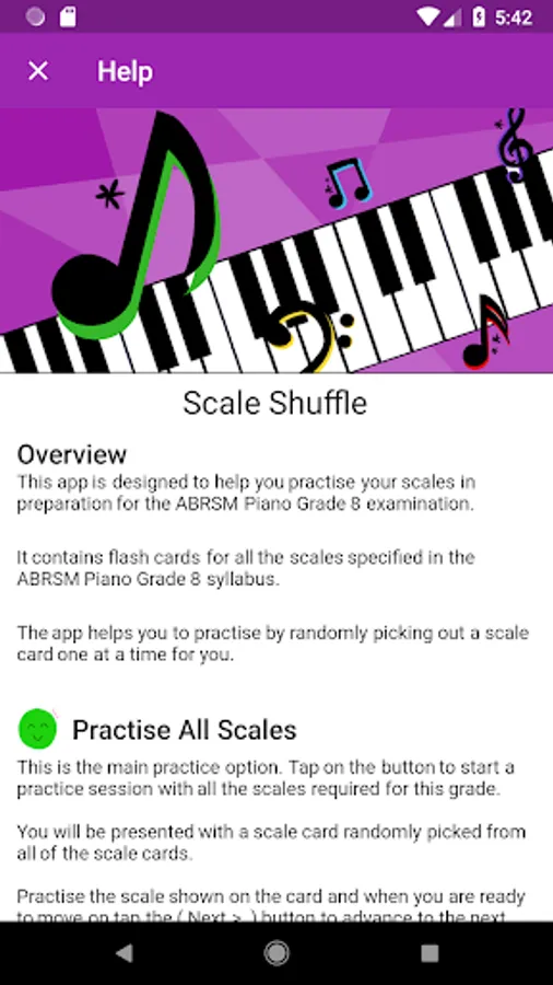 Scale Shuffle will systematically help you achieve your goal by picking out a scale flashcard for you to practise randomly, one at a time. The app contains all the scales from the most up-to-date ABRSM syllabus - and once you’ve practised all the scales, you can go back to the beginning and start all over again. The scale flashcards are shuffled each time you reset, so they’ll always appear in a totally random order.