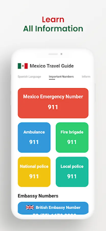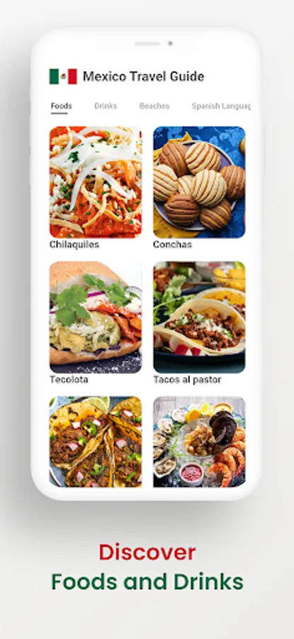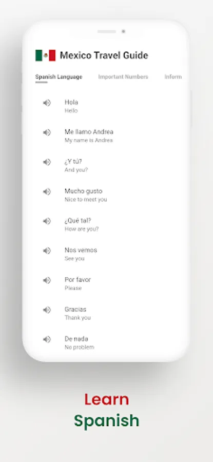 The sections in the application are: Mexico's popular cities, Mexico's popular places, Best Mexican Foods, Best Mexican Drinks, Best Beaches in Mexico, Learn Spanish Language, Informations about Mexico and Important Numbers in Mexico.