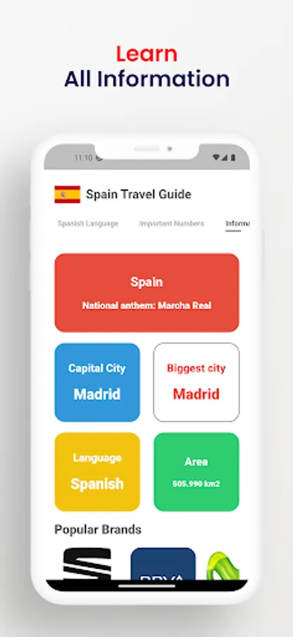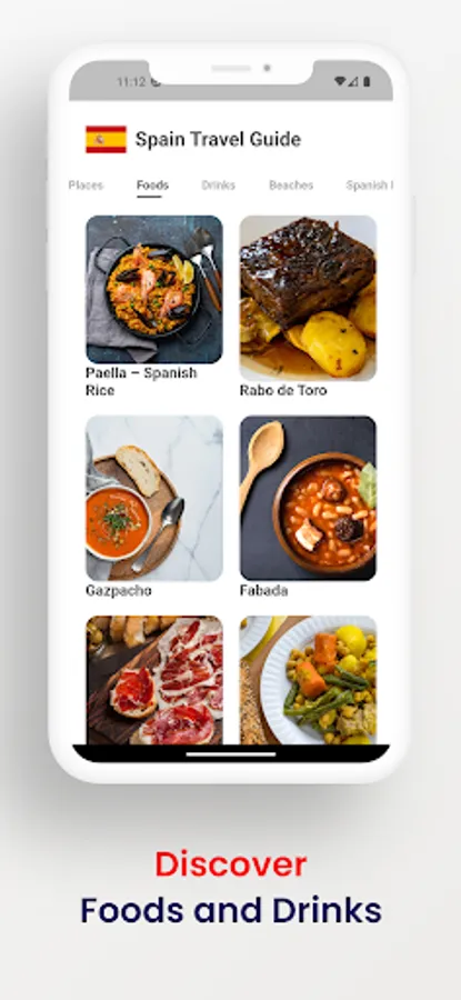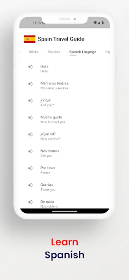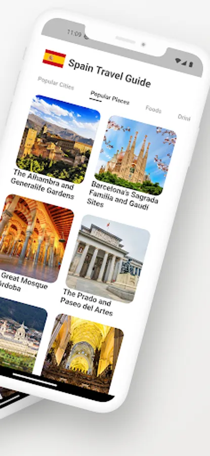 The sections in the application are: Spain's popular cities, Spain's popular places, Best Spanish Foods, Best Spanish Drinks, Best Beaches in Spain, Learn Spanish Language, Informations about Spain and Important Numbers in Spain.