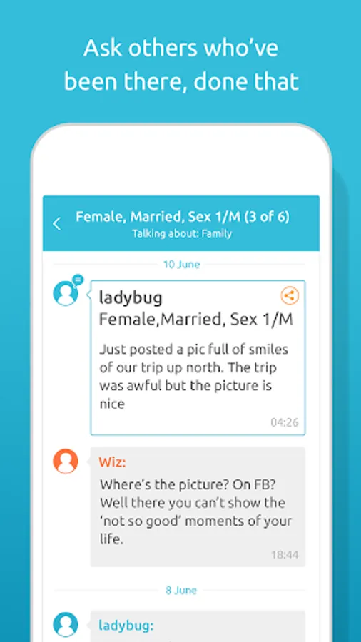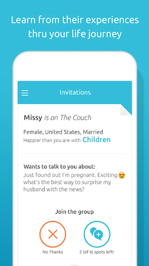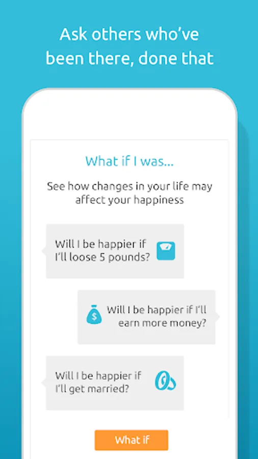 • Talk to other singles like you who will understand you and will always be there for you. Should you get married? Compare any aspect of your life to married people with the same profile as yours and see who's happier.