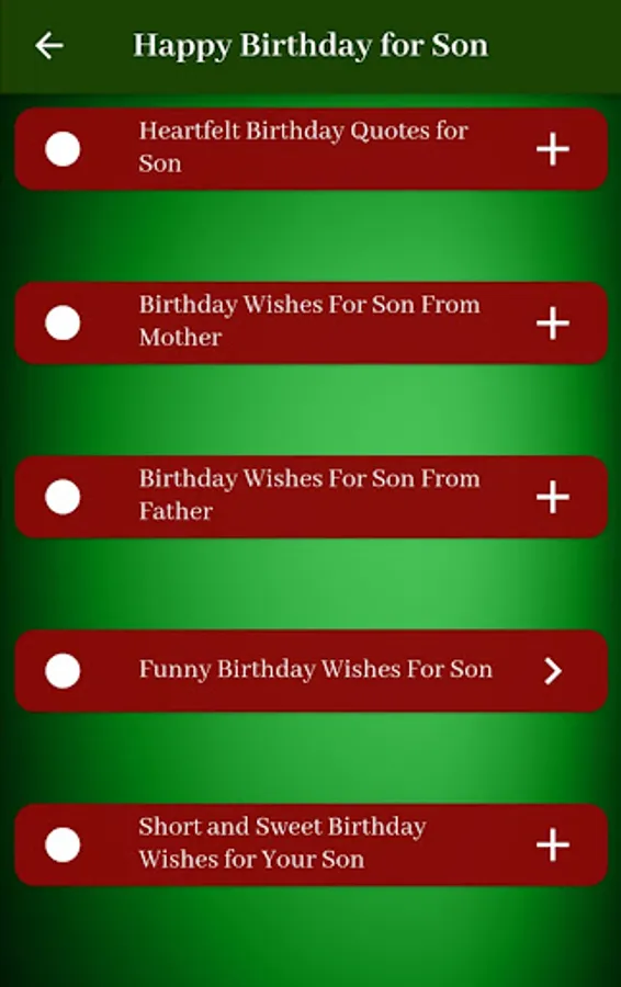 happy birthday greetings to my son The application provides a user-friendly experience where you can easily browse through a well-organized list of wishes and messages suitable for your son's birthday. You can select the message that best conveys your sentiments and suits your son's personality.