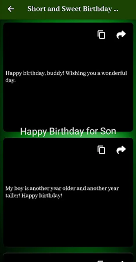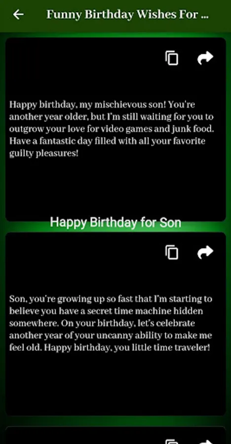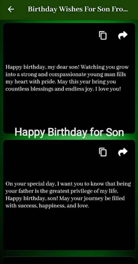 With "Happy Birthday for Son Wishes," you can effortlessly and with just a tap, send the selected birthday message to your son through social media, email, or even a text message.