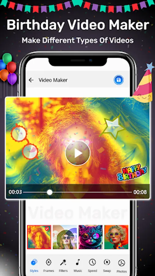 You will be able to choose unlimited photos from the gallery after you can easily make a Birthday videos with Song. Set the birthday video background music using the built-in music or select songs from your selection. In this Birthday app, You can add multiple transitions and animations with birthday stickers and emojis.