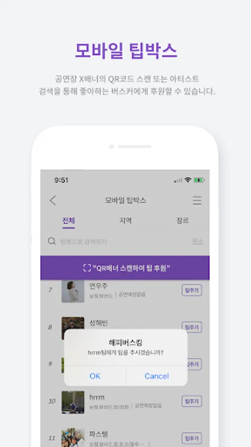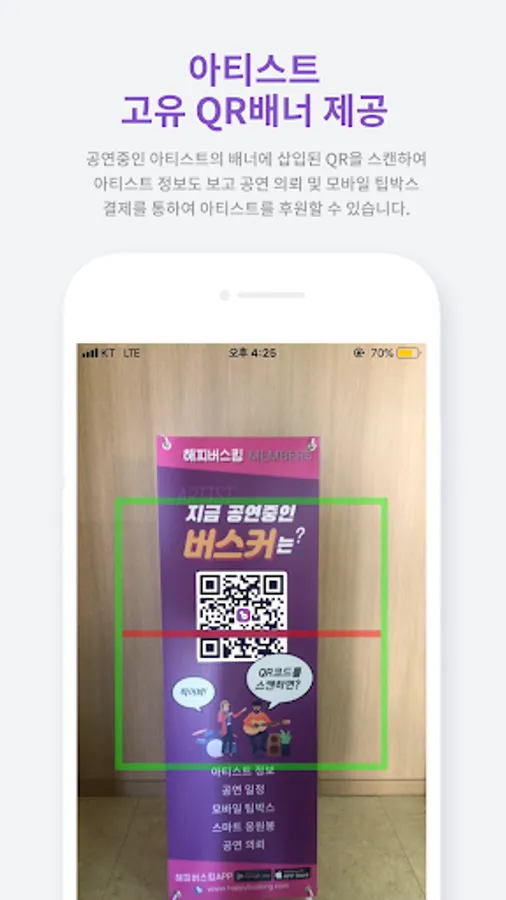 Scan the busker's unique QR banner provided at the concert hall with your smartphone to check information such as artist introduction and performance schedule.