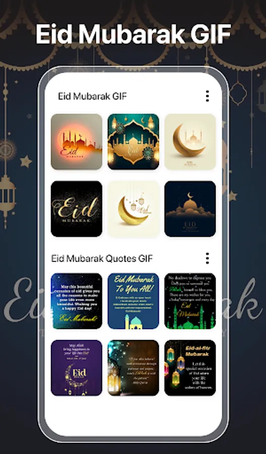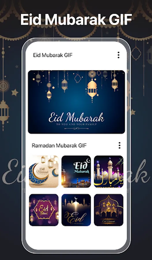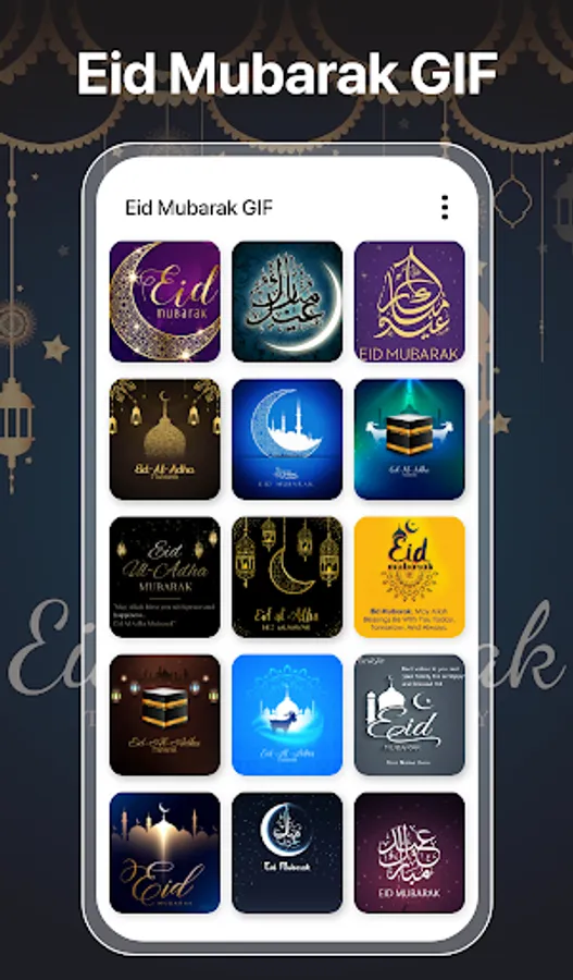 Eid Mubarak GIF, choose your card from varieties of "Eid Mubarak" animated images from the grid view of thumbnails.