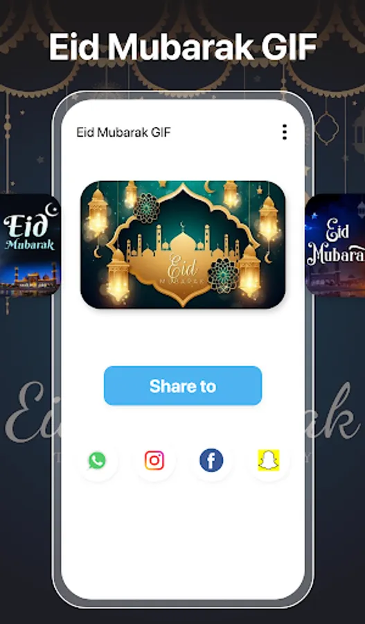 Eid Mubarak GIF App contains the best Eid Mubarak (animated Gifs) that is easy to share with friends and family in social networks. Share GIFs on whatsapp, Snap chat, face book, messenger, twitter, instagram, telegram, all or pretty much any chat or social network.