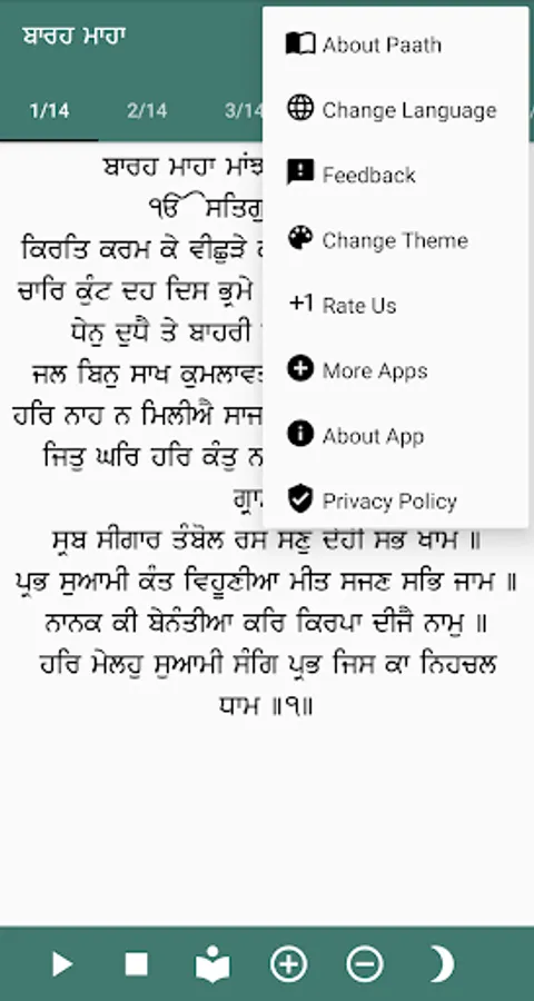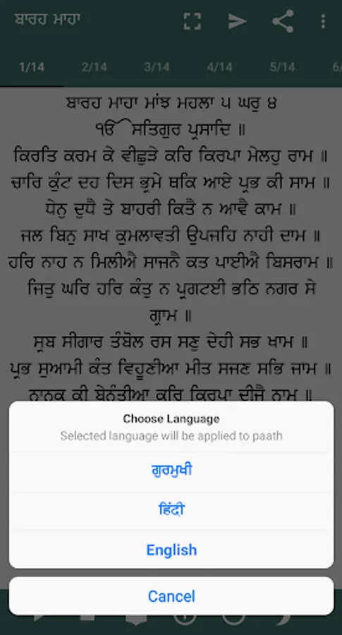 5) User can select paath language from Gurmukhi(Punjabi), Hindi and English.