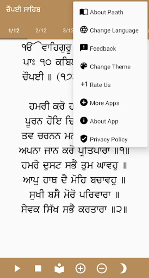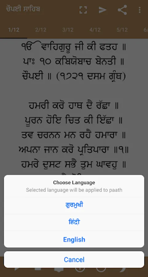 5) User can select paath language from Gurmukhi(Punjabi), Hindi and English.