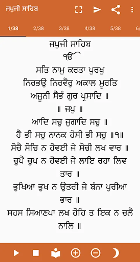 Japji Sahib is a Sikh prayer, that appears at the beginning of the holy scripture of the Sikhs, the living Guru, Guru Granth Sahib. It was composed by Guru Nanak Dev, the founder of Sikhism. It is headed by Mool Mantra and followed by 38 paudis (stanzas) and completed with a final Salok at the end of this composition.