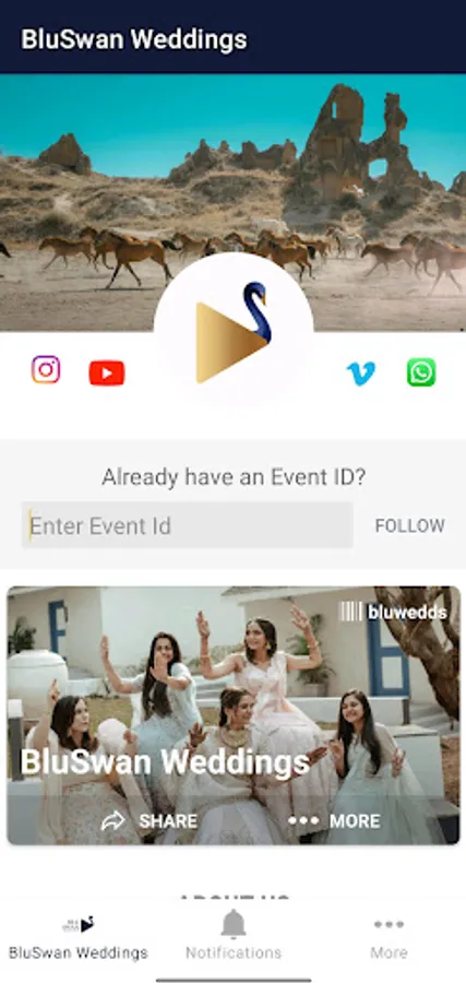 "The BluSwan Weddings app is a platform for sharing event photos instantly, allowing users to preview and share pictures on social media networks.