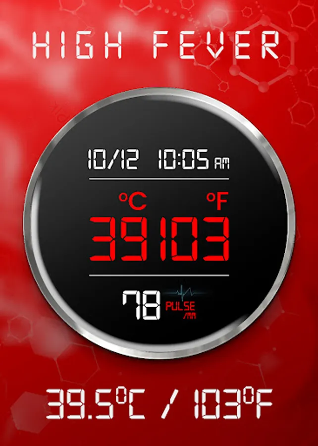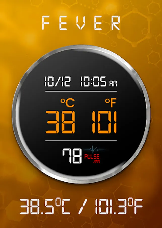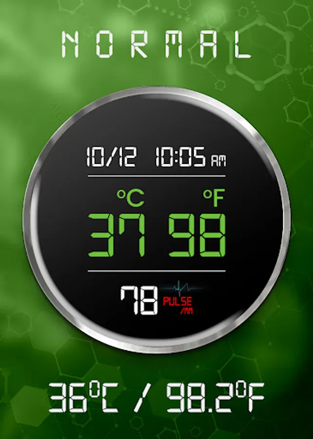 This app is created to analyze your body temperature values and does not measure your fever and pulse. All result values are random generated.