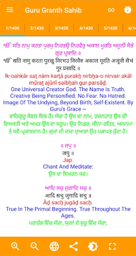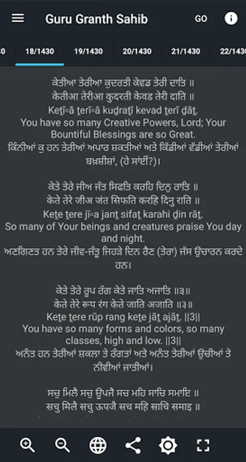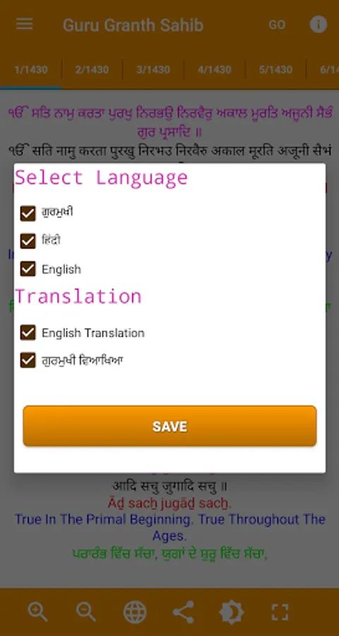 3) Gurmukhi (Punjabi) and English translation (Vyakhya) on every Ang (page).